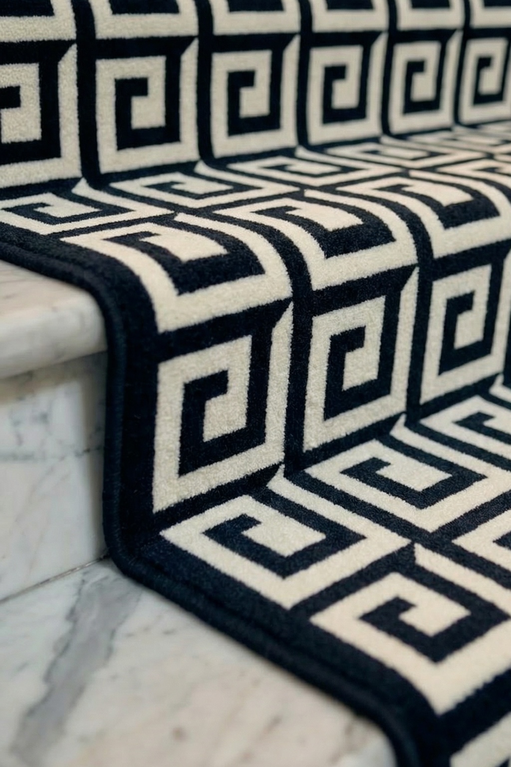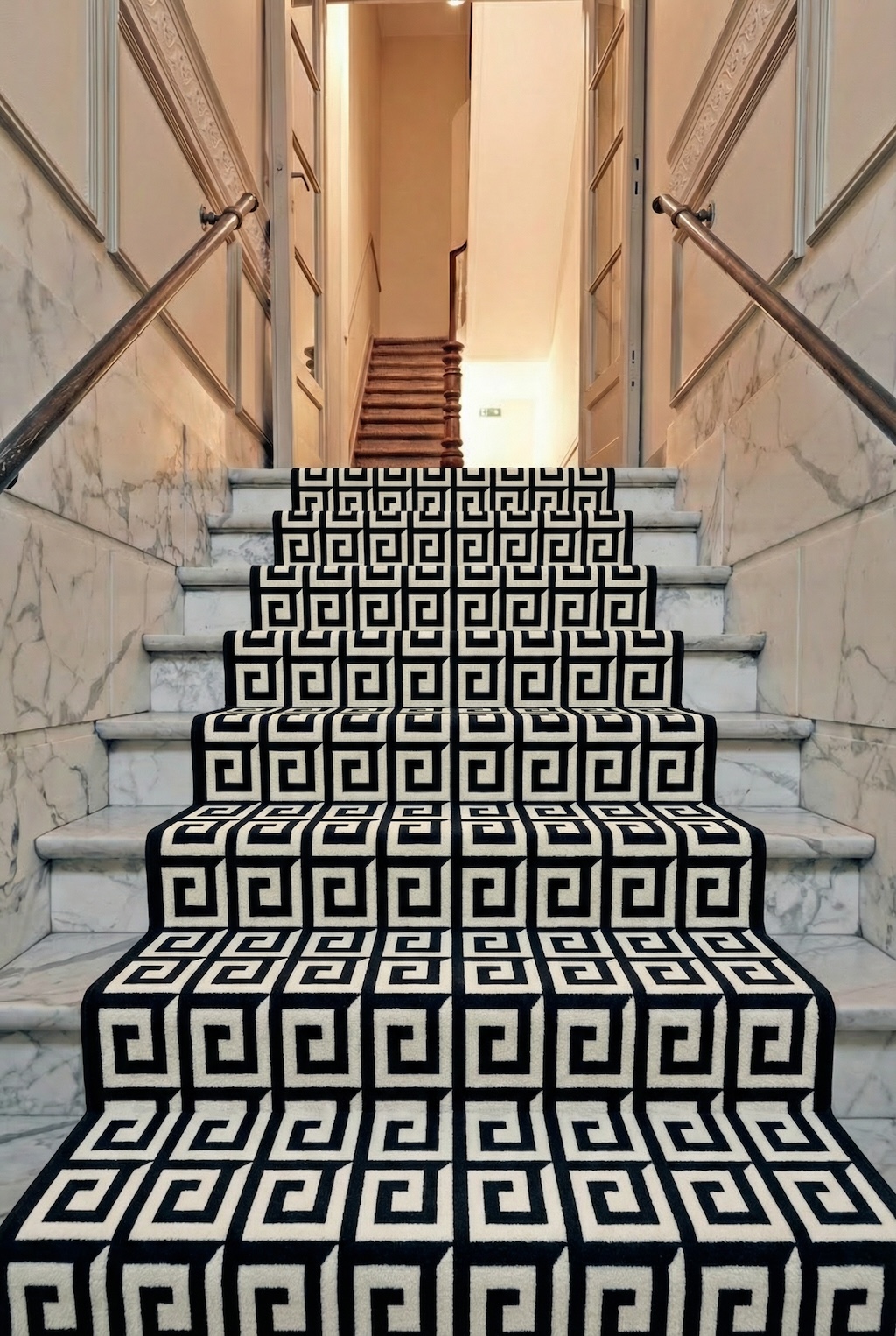 Geïnspireerd op klassieke patronen. T&M Bolsena is een luxe traploper of loper, helemaal op maat gemaakt. Het herhalende lijnenspel straalt kracht en structuur uit. Deze loper of traploper is perfect voor een luxueuze uitstraling in een entree of op de trap.