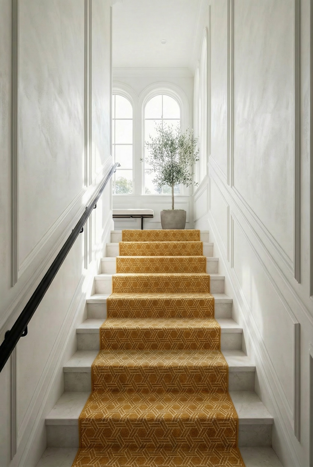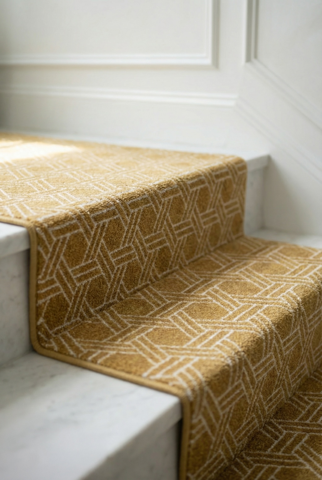 T&M Como combineert speelse geometrie met een luxueuze uitstraling. De herhalende, verweven vormen brengen ritme en balans in je ruimte – ideaal als eyecatcher in de gang of op de trap. Als printtapijt is dit dessin volledig aanpasbaar: van kleuren en grootte tot materiaalkeuze en randafwerking.
